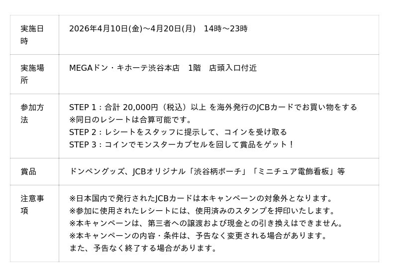 今回のイベントは海外発行のJCBカード会員であればどなたでも参加可能です。利用対象店舗にて合計20,000円(税込)以上のお会計をJCBカードでご利用いただくと、「モンスターカプセル」を回すことができ、ドンペングッズ、JCBオリジナル「渋谷柄ポーチ」「ミニチュア電飾看板」等の賞品が当たります。