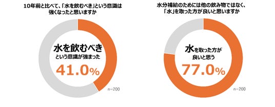 一方で、「10年前と比べて『水を飲むべき』という意識は強くなったと思いますか」という質問では、約4割が「強くなった」「やや強くなった」と回答しました。健康情報の普及や熱中症対策の啓発により、「水」での水分補給の重要性に対する認識は確実に高まっています。「水分補給のためには他の飲み物ではなく水を取った方が良いと思いますか」という質問では、約8割が「そう思う」「ややそう思う」と回答しており、水の重要性は理解されていることがうかがえます。