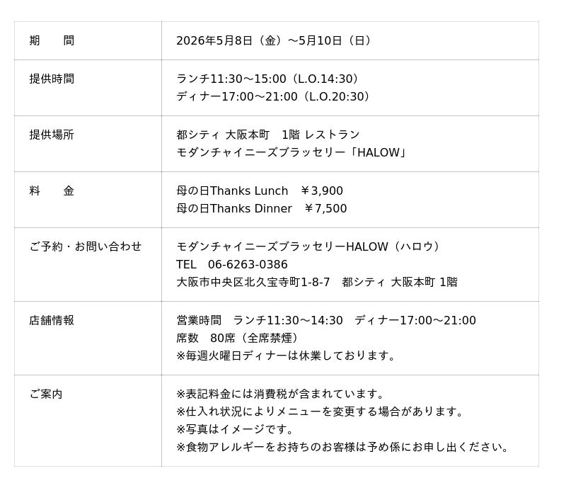 都シティ 大阪本町(所在地:大阪市中央区北久宝寺町1-8-7)は、2026年5月8日(金)から5月10日(日)までの3日間限定で、館内レストラン モダンチャイニーズブラッセリー「HALOW」(ハロウ)にて母の日限定メニューを提供します。