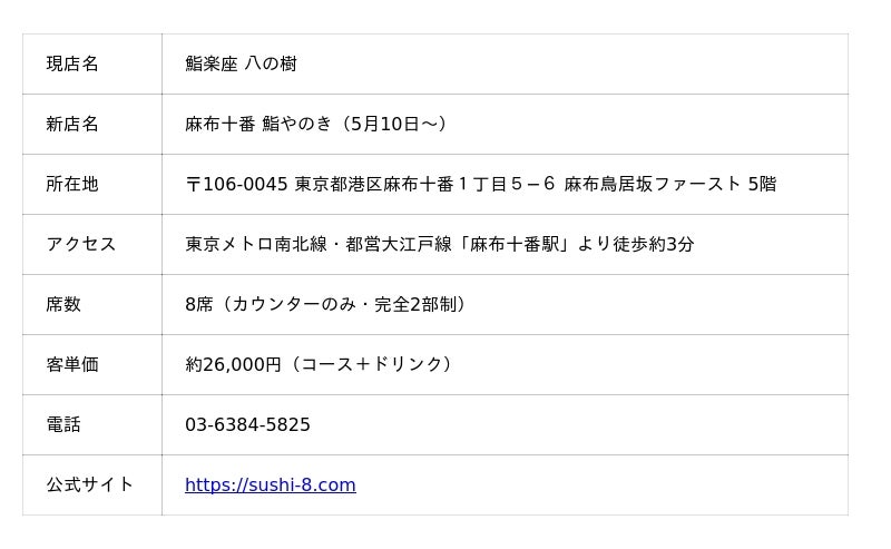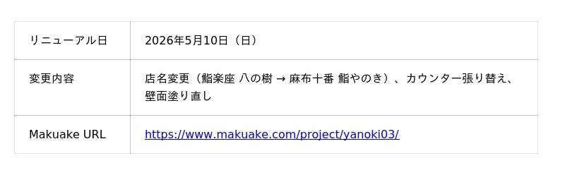 「3度目のMakuakeでこれだけ多くの方にご支援いただけたことは、本当にありがたく思っています。1回目は、路面店でもなく知名度もない中で、より多くの人に知ってもらいたい一心で始めました。2回目は料理やサービスが確立してきたタイミングで。そして今回は、3年間で到達した味と空間のすべてを込めた集大成です。5月10日のリニューアルでは、より洗練された空間で皆様をお迎えします。麻布十番という街で4年目を迎えられること自体が、この店に関わるすべての人のおかげです。新しい『麻布十番 鮨やのき』でお会いできることを楽しみにしています。」
