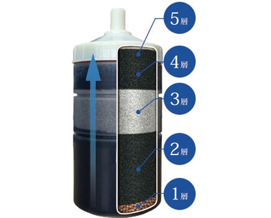 カルシウムやマグネシウムなどのミネラルが少ない日本の水道水を、5層カートリッジ内の高純度活性炭により化学物質を吸着・浄化その後、セラミックと焼成サンゴ(サンゴ化石)から溶出する豊富なミネラルを含ませる事により、ヨーロッパ水質の浄化水をご提供します。