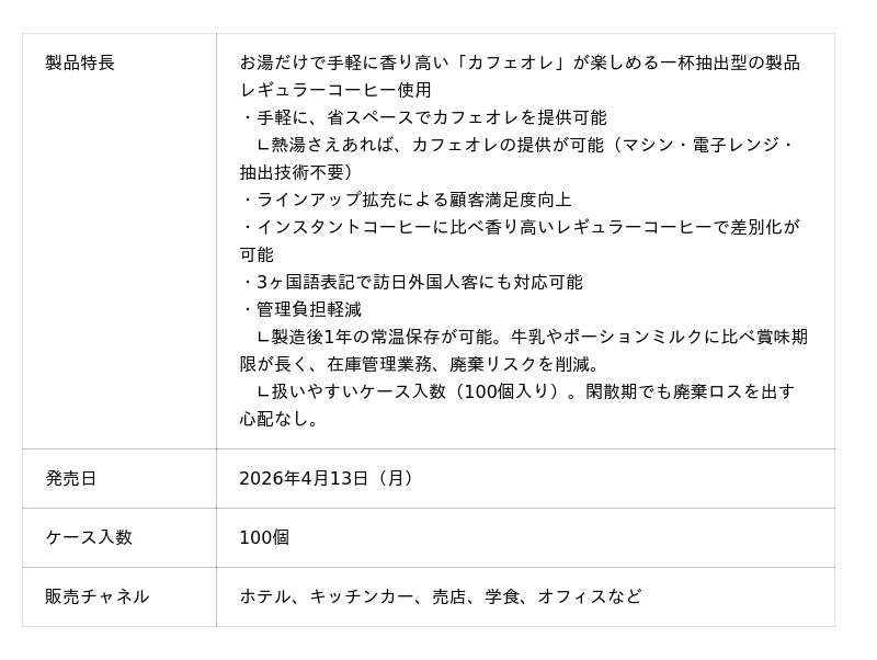 UCCグループで業務用サービス事業を展開するUCCコーヒープロフェッショナル株式会社(本社:東京都港区、社長:加藤勝彦)は、お湯を注いでディップするだけで手軽に本格的なカフェオレを味わえる一杯抽出型の業務用製品『UCP ディップコーヒー カフェオレタイプ 業務用 9g』を4月13日(月)に新発売します。