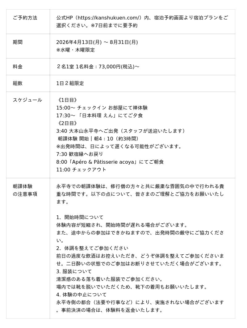 このたび、株式会社アクアイグニス(本社:東京都中央区、代表取締役:立花哲也)が運営する、福井県永平寺町の温泉オーベルジュ〈歓宿縁 ESHIKOTO〉では、禅の精神に触れる特別な体験プランをご用意いたします。