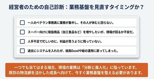 青果卸・食品卸の経営では、「忙しいのに利益が残らない」「人を増やさないと回らない」