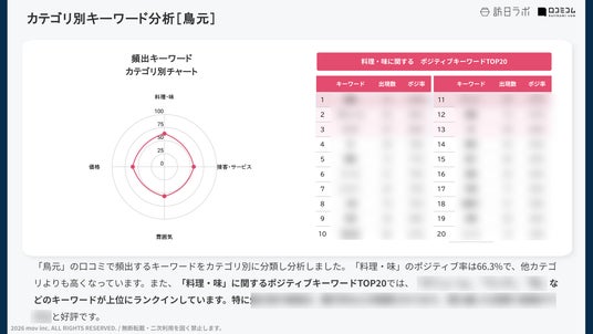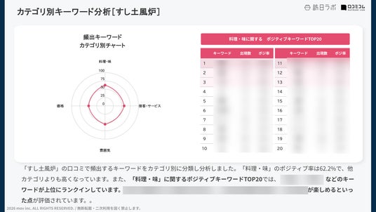 また。両ブランドの口コミに頻出するキーワードをカテゴリ別(料理・味 / 雰囲気 / 価格 / 接客・サービス)に分析し、「料理・味」のカテゴリでのポジティブキーワードTOP20も発表しています。