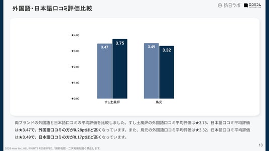 両ブランドの日本語口コミと外国語口コミの平均評価を比較したところ、「すし土風炉」では、日本語の口コミ平均評価★3.47に対し、外国語では★3.75と外国語の方が0.28ポイント高い評価を獲得していました。