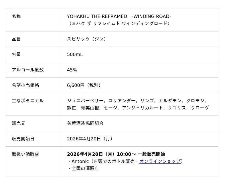長野県の豊かな自然と芙蓉酒造の経験と技術から生み出されたジン「YOHAKHU」を手掛ける蒸留家 依田昂憲氏と、ジントニック専門店「Antonic」による、コラボレーションジン『YOHAKHU THE REFRAMED -WINDING ROAD-』を2026年4月20日(月)に発売する。