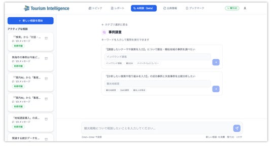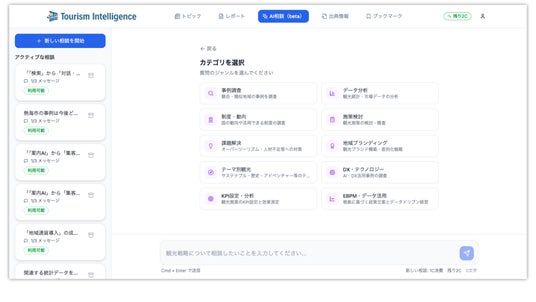 Tourism Intelligenceは、47都道府県の観光データと国の統計情報をAIが横断分析する、観光ビジネス向けの情報・分析プラットフォームです。「AI相談」「テーマ別AIレポート」「週次トピック配信」の3つの機能で、案件ごとのリサーチから提案資料のベース作成までを支援します。