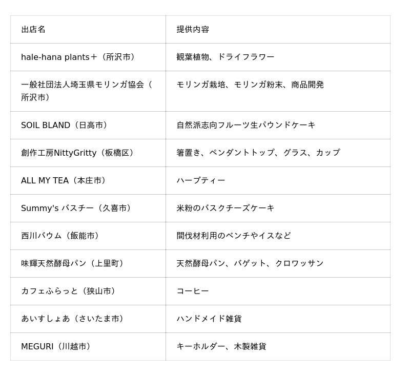 埼玉県内各地の事業者によるスイーツ・カフェ・クラフト作品・観葉植物など、多彩な商品が揃い、訪れるたびに新たな出会いや発見が生まれる場を目指します。