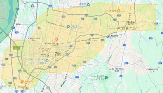 - 栃木県:益子町、大田原市、矢板市、真岡市(黄色部分。青色部分は既存提供エリア)