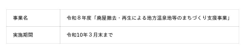 日本の地方温泉街等においては、かつて団体旅行向けに建築された大規模旅館等の廃屋化が進行し、景観の悪化や安全性の低下が課題となっています。さらに、多額の解体・減築費用が足かせとなり、再生が進まないことが事業上のボトルネックとなっています。本事業は、温泉街等の中心地に残存する廃屋の撤去及び減築による新たな宿泊施設等への再生や関連事業に要する費用の一部を補助するものであります。廃屋の再生を通じた「まちのにぎわい再生」及び「地方誘客の促進」を実現し、持続可能な観光地づくりを支援することを目的としております。