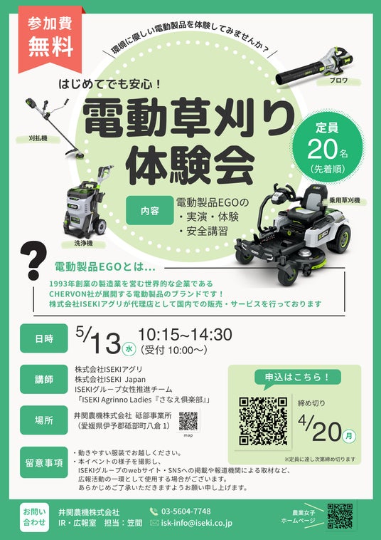 ISEKIグル-プは、農林水産省が取り組む「農業女子プロジェクト」に2013年より参画し、企業個別活動として「夢ある“農業女子”応援Project」を実施しています。そしてこのたび、活動の一環として電動製品を用いた草刈り体験会を開催いたします。