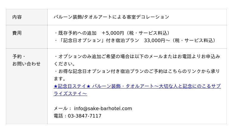 シマダグループの一社であるシマダハウス株式会社(東京都渋谷区、代表:島田一成)が運営する「SAKE Bar Hotel ASAKUSA」(東京都台東区駒形)では、宿泊プランにプラスして、誕生日や結婚記念日、推し活など、大切な日の滞在を彩る「記念日オプション」の販売を開始しました。