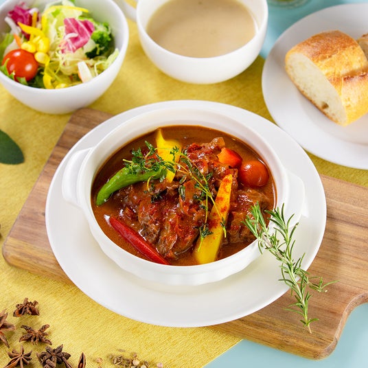 やわらかく煮込んだ国産牛すね肉に、パプリカの甘みとスパイスの香りが食欲を優しく刺激するグヤーシュ。ほっとする味わいで、初夏にぴったりです。(サラダ、スープ、パン、ドリンクバー付き)