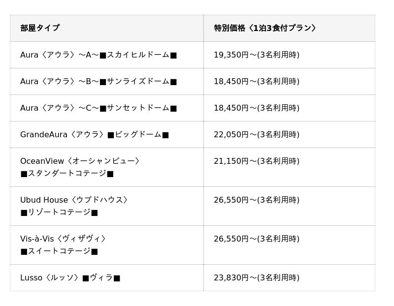 (※)AURA(B)(C)にて1室3名利用時の1名あたりの料金