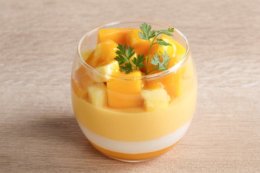 マンゴージュレ、ココナッツムース、マンゴームースを3層に重ね、マンゴーとパイナップルを飾り、パッションフルーツのソースを流しました。マンゴーの濃厚な甘みとココナッツの甘い香りにアクセントとしてパッションフルーツの爽やかな酸味を加えた、トロピカルな味わいのグラスデザートです。