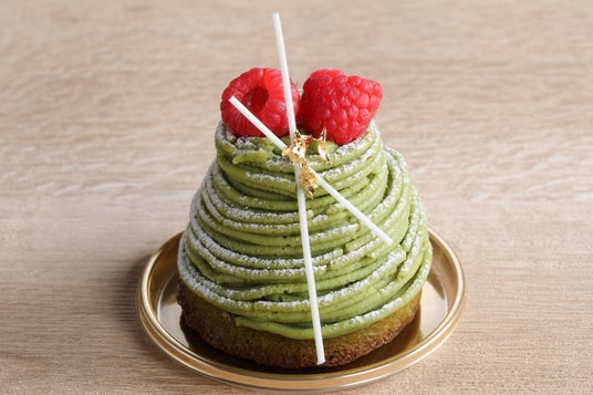 抹茶の渋みと栗のやさしい甘み、ラズベリーの酸味が絶妙に調和したモンブラン。抹茶フィナンシェの上にラズベリーのジュレを閉じ込めたバニラムースをのせ、抹茶と和栗のペーストを合わせたクリームを絞りました。