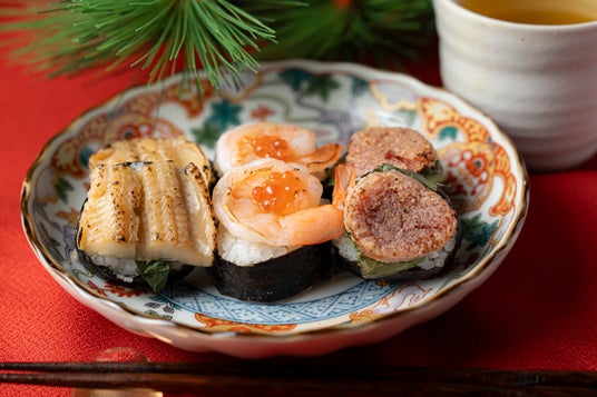 巻き寿司は、スモークサーモンで巻いた一品や、めはり寿司をイメージした巻き寿司、ローストビーフを使用したものなど、バリエーション豊かに展開。