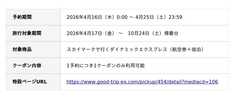 日本空輸株式会社(本社:東京都港区、代表取締役:岡下 敏也)が運営する旅行予約サイト『グッドトリップエクスプレス(グットリ)』は、 会員様限定で、航空券と宿泊を自由に組み合わせられるダイナミックパッケージが最大35,000円OFFとなる「スカイマークで行く春旅セール」を、 2026年4月16日(木)から4月25日(土)までの10日間限定で実施します。 本セールでは、ご旅行代金の合計金額に応じて利用できる、6種類の特別クーポンを配布します。 今すぐ行きたい直近の旅行からGWや夏休み・秋の連休など、10月24日帰着分までが対象の短期間特別セールです。高額なご旅行ほど割引額が大きくなるため、ご家族やグループでの少し贅沢な旅をするなら、今が見逃せないチャンス!
