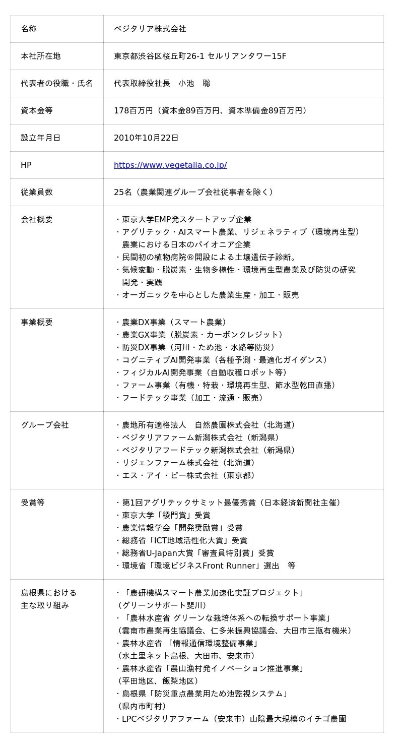 ベジタリア株式会社(本社:東京都渋谷区、代表取締役社長:小池 聡、以下、ベジタリア)は、ライスフィールド有限会社(本社:島根県松江市、代表取締役:吉岡 雅裕、以下、ライスフィールド)に資本参加を行い、両社の持つ農業を中心とする知見・技術・ノウハウ、植物科学、デジタル技術および経営資源を結集することで、気候変動、脱炭素、化学肥料・燃料等資材の高騰と食料安全保障といった農業を取り巻く環境変化に応じた持続可能かつ高収益な農業モデルの確立を目指し、日本の次世代型農業の革新と担い手の育成に寄与することを目的に、下記の概要にて資本業務提携を行いましたことをお知らせいたします。