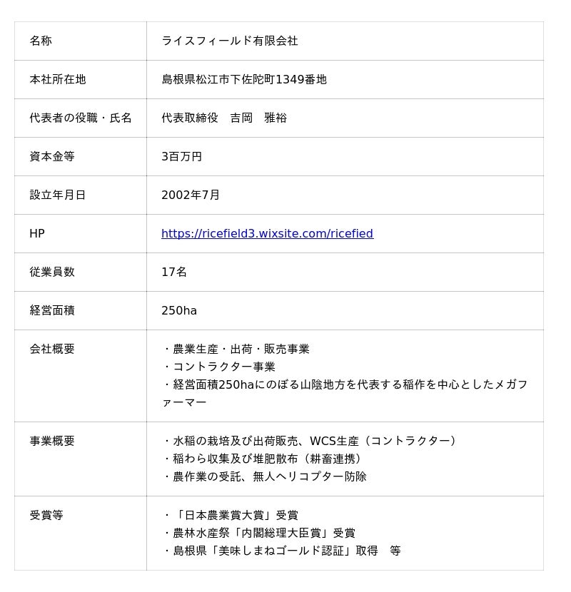 ライスフィールドは、日本農業賞大賞や内閣総理大臣賞を受賞するなど山陰地方を代表する大規模稲作経営体であり、経営・技術の改善や社員の育成にも意欲的で地域の発展にも貢献しています。