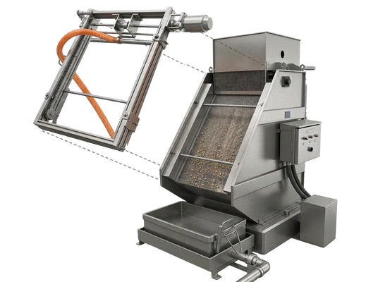 本製品は、食品加工工場における排水処理工程の清掃作業効率化と目詰まり防止を目的に開発され、これまで人手に頼っていたスクリーン清掃作業の自動化を実現します。