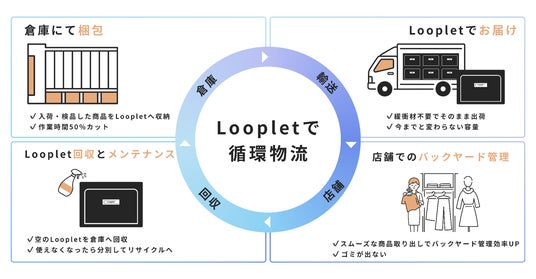 倉庫で商品をLoopletに収納し出荷した後、店舗ではそのままバックヤードや売場で活用され、使用後は再び回収されて倉庫へと戻ります。回収されたLoopletは、必要に応じてメンテナンスをへて再び流通に組み込まれます。