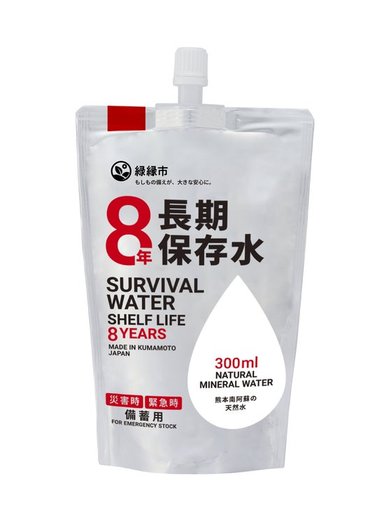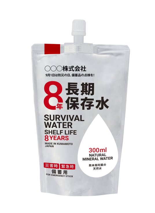 2016年の熊本地震で、当社製造拠点である南阿蘇においても断水が長期化し、日本有数の水源地でさえ飲料水が届かない現実を目の当たりにしました。この経験が「8年間確実に守れる水をつくりたい」という問いを生みました。2012年からパウチウォーター事業を開始し、累計1,300万本以上の出荷実績を重ねてきた当社は、同商品の技術とブランディングノウハウを活かし、防災備蓄品を「ただの備蓄品」から「企業・自治体の名前を冠したブランディングツール」として提供することを目指しました。