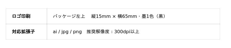 パッケージ左上エリア(縦15mm × 横65mm)に貴社のロゴ・社名・メッセージを墨1色で印刷できます。「自社ブランドの備蓄水」として、社員・取引先・地域住民に届けられます。