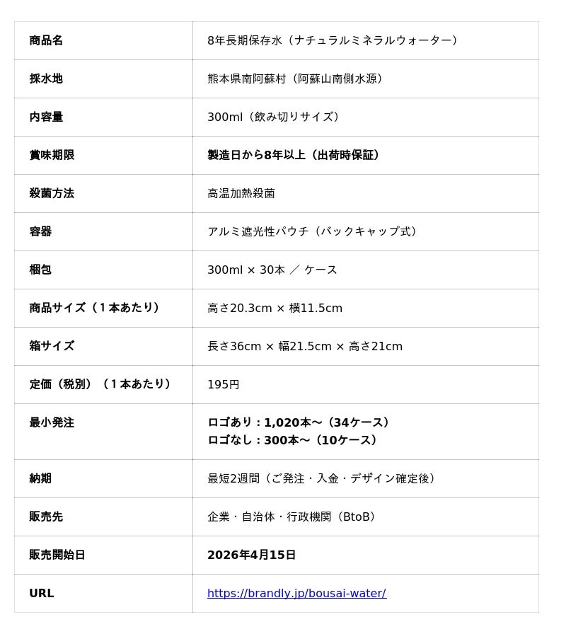 本商品は、熊本県南阿蘇村の天然ミネラルウォーターをアルミ遮光性パウチに封入し、高温加熱殺菌を施した8年以上の賞味期限に対応した長期保存水です。ゴミ量をペットボトル比で71%削減するパウチ容器により、防災備蓄とSDGs活動を同時に実現します。アパレル・IT・美容・ホスピタリティなど感度の高い企業500社以上に採用されてきたオリジナルウォーターbrandlyの技術と哲学を、防災備蓄の領域に展開します。