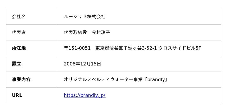 2012年に熊本南阿蘇の天然水を使ったパウチウォーター事業をスタート。「あなたのデザイン、あなたのお水」をコンセプトに、環境にやさしいパウチ容器×オリジナルデザインを組み合わせた商品を提供してきました。アパレル・IT・美容・ホスピタリティなど感度の高い企業500社以上に採用され、累計1,300万本以上を出荷。ラグビーワールドカップ2019ノベルティ品への選定、明治神宮への毎年奉納、Blue Impulse TOUR 2023での採用など、数多くの実績を持ちます。実用新案登録済み(登録第3243421号)。■brandlyのオリジナルノベルティウォーター事例はこちら