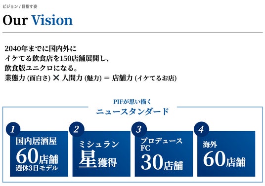 - 2040年までに国内外150店舗展開(“飲食版ユニクロ”を目指す)