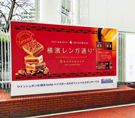 横浜スタジアム外周Yデッキ(5ゲート向かい)に、ウイッシュボンの立て看板を設置。スタジアムへ足を運ぶファンの皆様の、勝利を願う熱い気持ちに寄り添い、観戦のひとときを彩る存在になればと願っております。