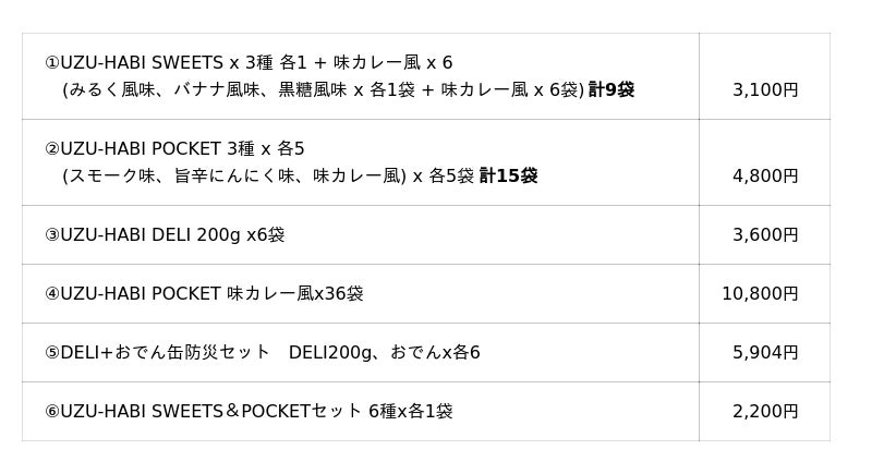 新発売するUZU-HABI POCKETは、リニューアルするUZU-HABI DELI、UZU-HABI SWEETSをセットにしたアソートのほか、天狗缶詰の看板商品「おでん缶」を含めた防災セットにして発売します。大切なご家族への贈り物としてや、ご自宅の備蓄用としてもご活用ください。