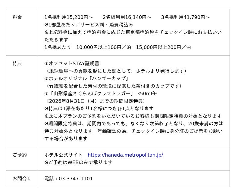 羽田空港第3ターミナルから1駅の天空橋駅に位置するホテルメトロポリタン 羽田(運営/日本ホテル株式会社 総支配人/塩原 健)は、2025年10月より販売している環境貢献型宿泊プラン「CO2ゼロSTAY(R)プラン」において、2026年4月15日(水)から2026年8月31日(月)までの期間限定で特典内容をアップグレードします。