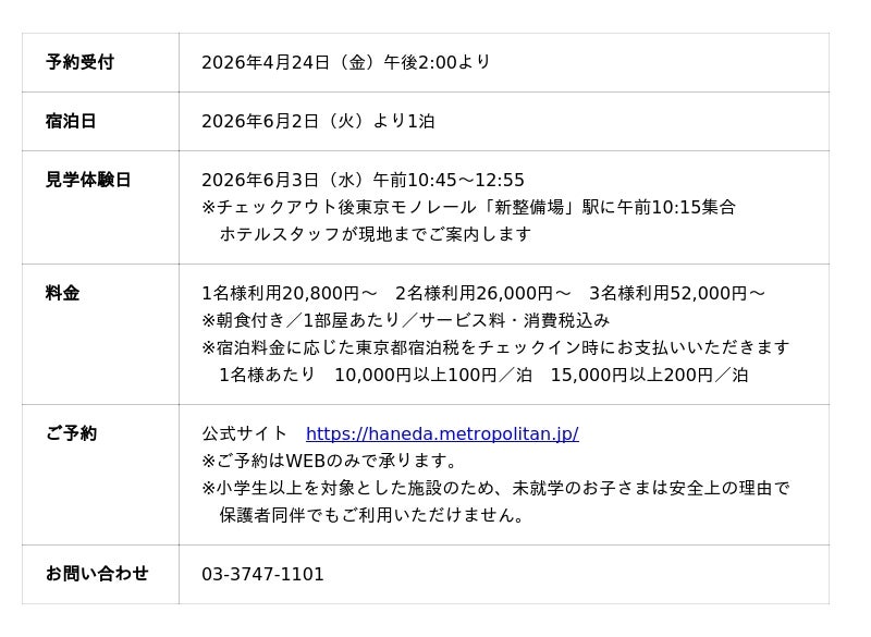 羽田空港第3ターミナルから1駅の天空橋駅に位置するホテルメトロポリタン 羽田(運営/日本ホテル株式会社 総支配人/塩原 健)は、日本航空株式会社(以下:JAL)が運営する「JAL SKY MUSEUM」の見学体験が付いた宿泊プランを販売します。