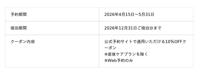 公式予約サイト限定 10%OFFクーポンどなたでも、何回でもご利用いただける10%OFFクーポン(※一部プランを除く)。