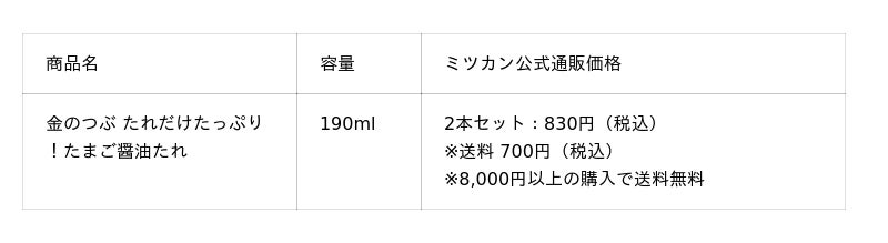 株式会社Mizkan(本社:愛知県半田市、代表取締役社長兼 CEO:槇 亮次、以下ミツカン)は、2026年4月15日(水)より「金のつぶ(R) たれだけたっぷり!たまご醤油たれ190ml」をミツカン公式通販にて発売開始いたします。