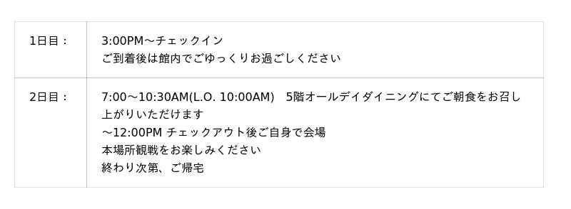 ・観戦日はチェックインの翌日となります。
