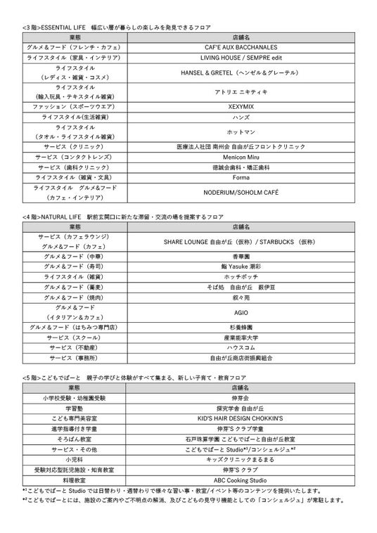 地上5階、地下1階のフロアには、商業施設初、新業態、自由が丘の歴史ある名店など、食やトレンド、ファッション、暮らしの楽しみを発見できる多様な店舗が揃います。アンカーテナントには、自由が丘に初登場の世界の美味と上質な日常を提案するプレミアムスーパーマーケット「明治屋 自由が丘ストアー」、働く・くつろぐ・語らう、自由が丘の新ラウンジ「SHARE LOUNGE 自由が丘(仮称) / STARBUCKS(仮称)」が出店。自由が丘のコミュニティハブとなる施設や、新しい子育て・教育の拠点「こどもでぱーと 自由が丘」なども本施設5階に開業します。また、カフェ併設のスイーツ店、自由が丘の名店の味など充実したグルメもお楽しみいただけます。