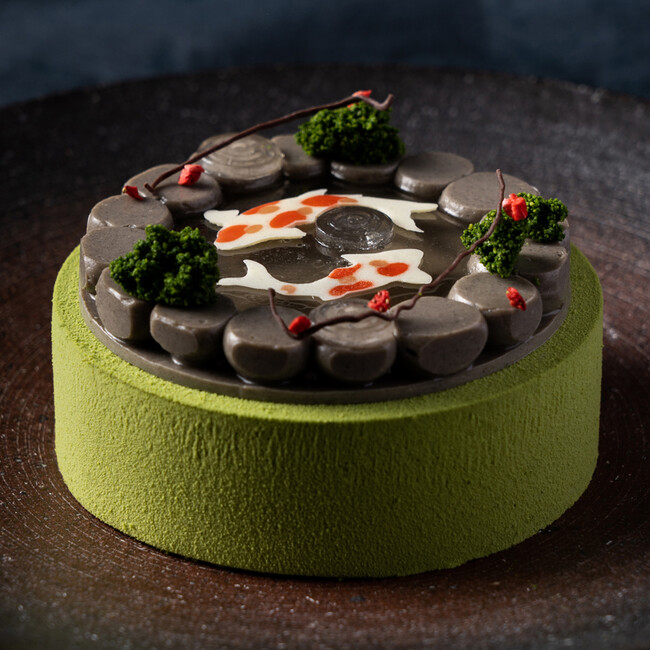 岩に見立てた黒胡麻のクリーム、ジュレで作られた池には、チョコレートの鯉が優雅に泳いでいます。