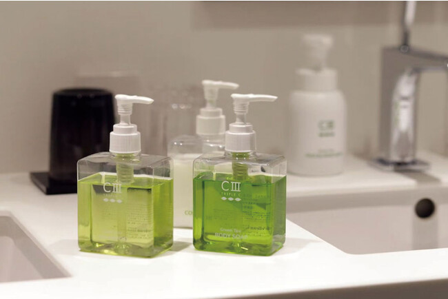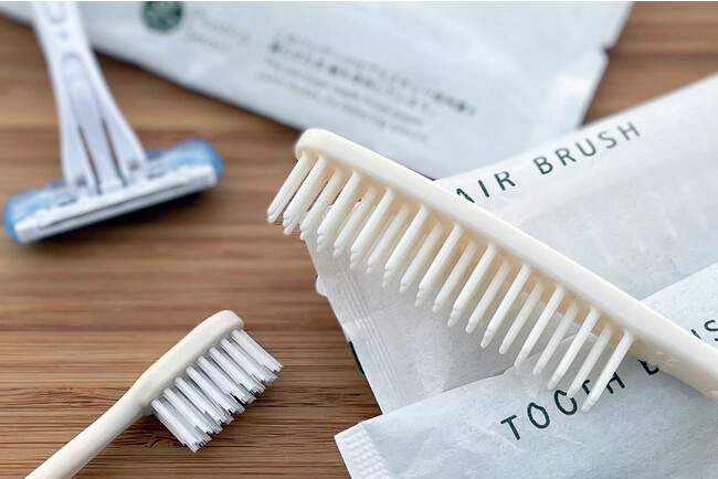 「プラスチック資源循環法」の対象となっている使い捨てプラスチックアメニティの中でも、総重量の約90%以上を占める、歯ブラシ、ヘアブラシ、レザー(カミソリ)の3点にバイオマスアメニティを導入しています。また、ゲストルームで提供しているアメニティボトル(シャンプー、コンディショナー、ボディーソープ)にディスペンサータイプを導入することにより、廃棄するプラスチック使用量の削減を行っております。