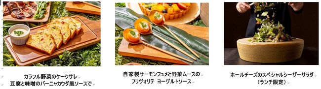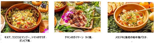 フランス、イタリア、メキシコ、タイ、中国、日本など各国からシェフ特選の料理が並びます。イタリアのカラフル野菜のケークサレ、チキンのガイヤーン タイ風、キヌア、クスクスを使ったヘルシーなサラダはガンビア風、20種以上の多国籍な料理を集めジャングルをイメージしたビュッフェです。