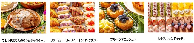 今回、ヒルトン成田のビュッフェ史上、初めて登場する「デニッシュペストリー食べ放題」には、ハード系のパンを器にしたブレッドボウルのクラムチャウダー。下部のパンも、スープが浸みて美味しくいただけます。その日のおすすめフルーツとデニッシュのパリパリとした歯応えが特長のフルーツデニッシュ、バターをたっぷり使ったクロワッサンにピスタチオ、プラリネショコラをトッピングした背徳感満載のスイートクロワッサン、紫芋、クリームチーズをロールパンにサンドしたクリームロールや小豆抹茶、いちご、マンゴー、ガナッシュショコラをサンドしたカラフルサンドイッチなど全8種のデニッシュペストリーが日替わりでお楽しみいただけます。パン好きの方が思う存分楽しめるビュッフェです。