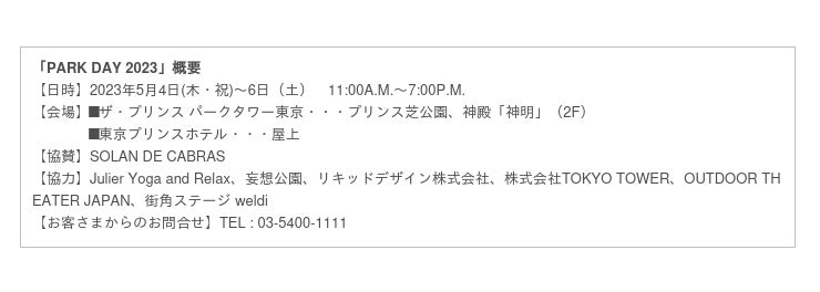 ザ・プリンス パークタワー東京(所在地:東京都港区芝公園4-8-1 総支配人:神田泰寿)と東京プリンスホテル(所在地:東京都港区芝公園3-3-1 総支配人:石川学)は、ホテル敷地内のプリンス芝公園をメイン会場としたピクニックイベント「PARK DAY 2023」を、2023年5月4日(木・祝)から6日(土)までの3日間開催いたします。