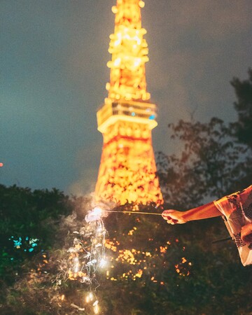 ステイプランのお客さまだけが体験できる、東京の真ん中で絶景とともに楽しむ花火。ライトアップされた東京タワーを背景に花火をしながら、一足早くここならではの初夏の思い出作りを。
