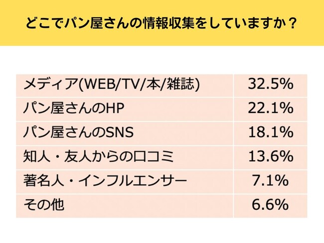 どこでパン屋さんの情報収集をしているかという質問に対し、最も多かったのは、TVやWEB、雑誌や本といったメディアからという回答でした。ホームページやSNSも上位だったものの、パン屋さんは個人経営のお店が多いため、あまり情報が更新されていなかったり、そもそもサイトやアカウントがないケースもあることが予想されます。