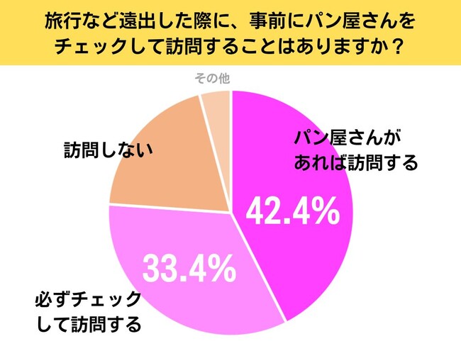 遠出する際に、必ず旅先のパン屋さんのチェックして訪問するという回答が33.4%、そして事前にチェックはしないが、パン屋さんがあれば訪問するという回答が42.4%となり、全体で75.8%の方が旅先でもパン屋さんに訪問していることがわかりました。