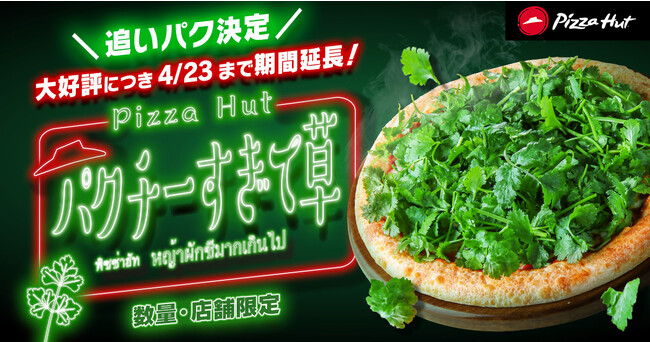 想定販売数の2倍以上を達成といった実績もさることながら、それ以上にSNSやメディアでも大きく取り上げていただき想像以上の反響に驚いております。盛り盛りのパクチーにこんなに皆さんが食いついてくれるとは・・! 〈新鮮なパクチーを独り占めできて満足〉〈箱を開けた瞬間マジで草〉〈完全にネタ?!苦手な人には地獄〉と賛否両論もありますが、〈パクチーこの倍あっていい〉とパクチストの皆さんはもちろんのこと、〈美味しい、レギュラー化してほしい〉〈終わっちゃう前にもう一度食べたい!〉と多くの声が挙がっているのを拝見し、販売終了日が迫る中でも冷めない盛り上がりに開発者一同嬉しい限りです。 そして皆様からの熱いリクエストにより、この度、追いパク(販売延長)を決定しました!※提供するパクチーの量は3株と変わりません。 販売期間を4月23日(日)まで延長いたしますので、まだパクチーピザに冒険できていない方もこのピザの美味しさに虜になってしまったパクチストの皆様も、ぜひピザハットで想像以上の一品を堪能してください!