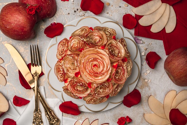 こちらは、リンゴを薔薇の花に見立てたアップルタルト。イチゴと並んで人気のタルトです。